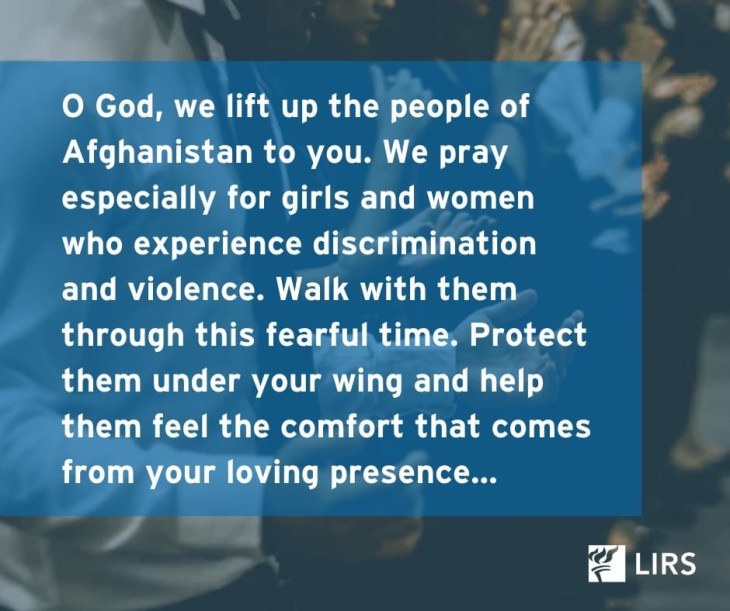 Gracious and holy God, We come to you with the situation in Afghanistan heavy on our hearts. It is a situation so complicated, and so fast-moving, that it is difficult for us to know what to say or how to think. We hold before you the people of the country, those who stay and those who flee; those living with terror and afraid for the future; those who, because of this latest turn of events, will never be able to live the fullness of life that is your purpose.
