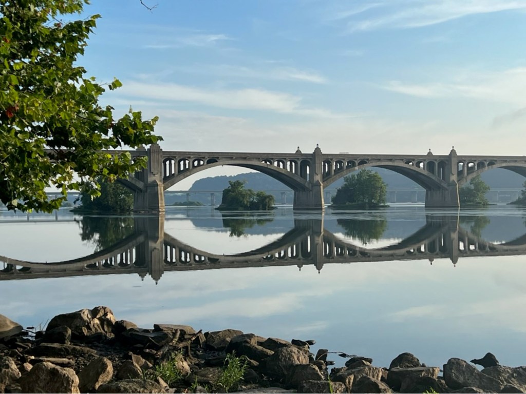 Historians can tell lots of stories about bridges between Wrightsville and Columbia, PA! Three of the efforts are visible in this amazing picture taken Aug. 1, when a quiet morning allowed the river to settle into a clear mirror image of the Rt. 30 bridge (1972), the concrete Veterans Memorial bridge (1930) and the tree-covered piers of the second Iron Bridge (1897) which carried trains, carriages and pedestrians across the mighty Susquehanna. Before that were wooden bridges, first built in 1814 and destroyed 18 years later by ice and high water, then rebuilt by 1834…both were the longest covered bridges in the world. The second was famously burned in 1863 to prevent the Confederate Army from crossing the river during the Civil War.