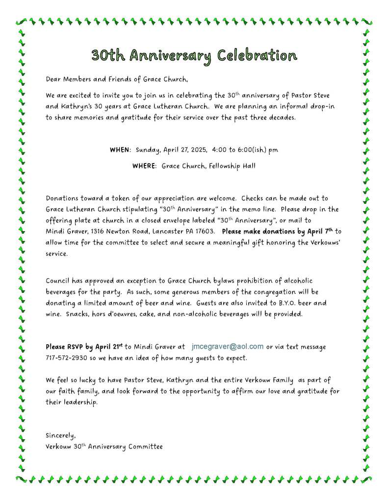 If you have any questions please contact Pastor Verkouw, Kath, or Angie.