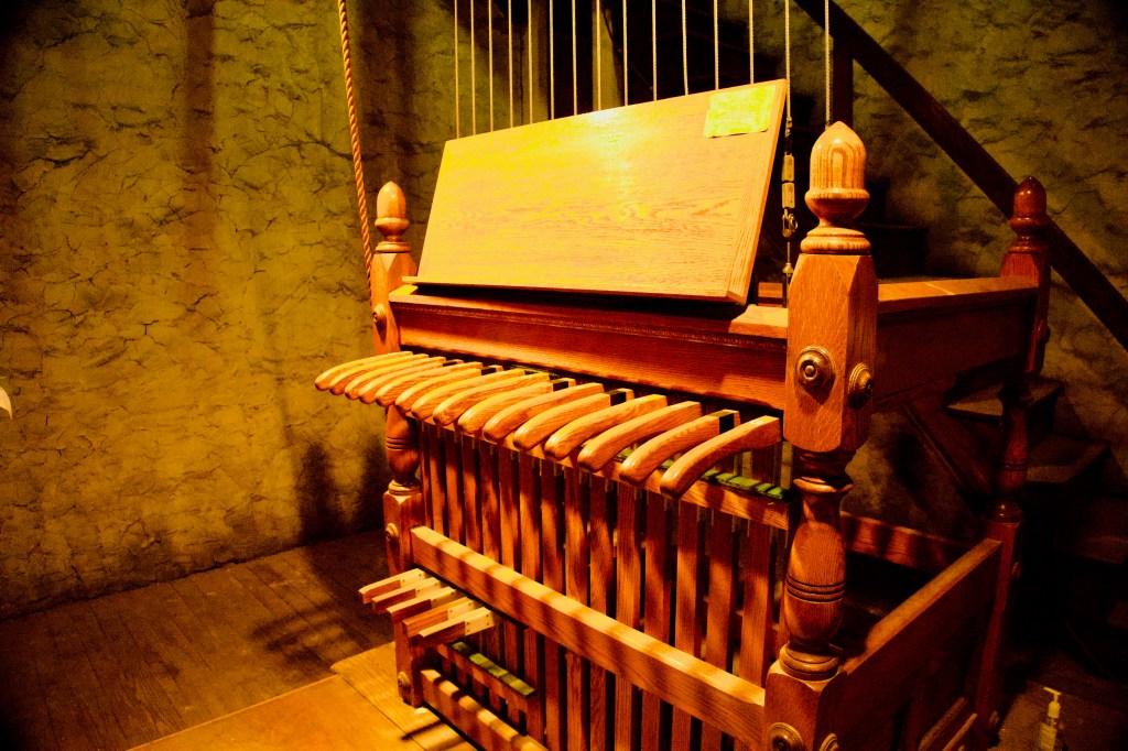 Our tower bells (technically a “chime”) are not rung by automated equipment but by congregation members. There is a console for “playing” the bells one level above the music balcony. It has “keys” similar to a piano keyboard, that are played by grasping and depressing.