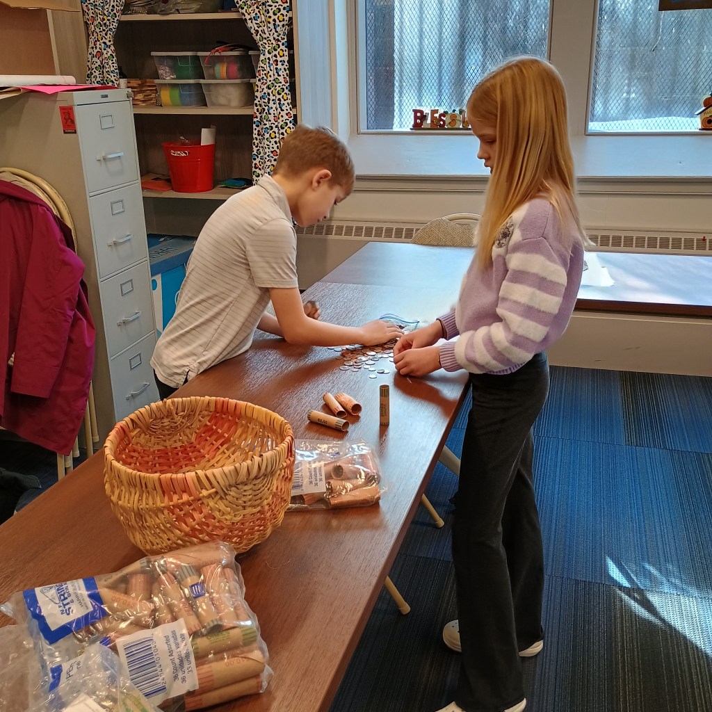 Mrs. Hartman’s Sunday School class counting their Global Barnyard Donations.